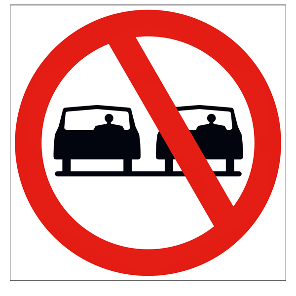 The No Overtaking Sign, RUS 014, prohibits overtaking at locations where it is considered dangerous to do so.