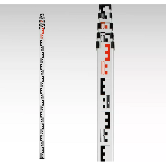 Anodised aluminium telescopic measuring rod for use when levelling with optical levelling instruments and lasers over great distances. Long-distance visible scale with 'E' gradations, mm scale on rear.