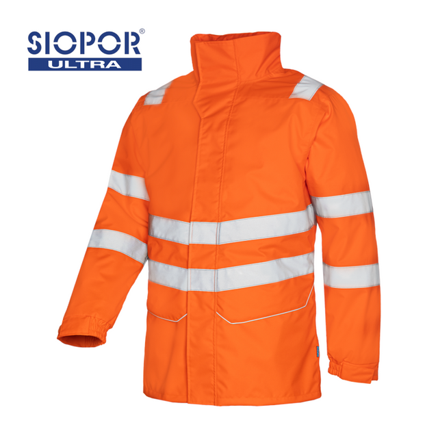 This is a practical 4-in-1 monocolour rain jacket which complies to the European high visibility norm EN 20471 and the British RIS-3279-TOM norm. It is made from our Siopor® fabric which has a water repellent polyester fabric on the outside but a breathable PU-coating on the inside. The advantage of this jacket is that you can transform it to your own needs. You can wear the rain jacket with our without the bodywarmer and on top of that you can choose to wear the bodywarmer with or without sleeves. This jacket is all about functionality: the rain jacket has an extra ID-pocket and you can attach a hood with chin protection to the collar.