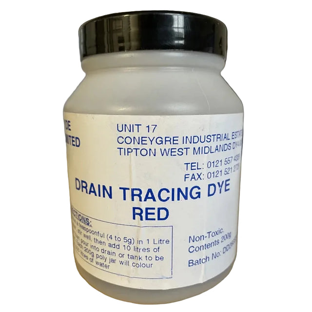 Drain dye for tracing pipes and detecting leaks. Simply mix the dye in a bucket of water and allow it to flow through the drain. Each 200g jar is sufficient to trace up to 15,000 litres of clear water, ensuring this is a cost-effective and efficient method.