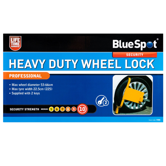 The Blue Spot Tools Heavy Duty Wheel Lock is an ideal security product for use on cars, caravans, trailers and small trucks. Designed with an extendable arm, it will clamp wheels up to 53cm-66cm diameter, with a 22.5cm (225mm) maximum tyre width. It fits in seconds and locks directly onto the wheel. The solid construction and compact size allow easy storage when not in use. It is supplied with 2 sets of keys.