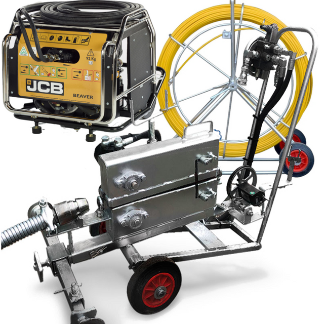 The duct rod pushers are designed to assist in rodding operations. The units are mounted on sturdy, anti-corrosion treated tubular steel frame, and fitted with solid rubber tyres, with hydraulic controls mounted on the frame for ease of transportation. The pushers are fitted with an extendable boom, and chamber clamp for use in underground structures.