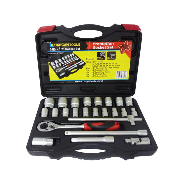 Professional Quality Square 1/2” drive Sockets & Accessories. Manufactured from Chrome Vanadium Steel. Hardened & Tempered with Satin finish for Corrosion Protection. Chamfered ends allow positive nut location. 18x 12 point Metric Sockets