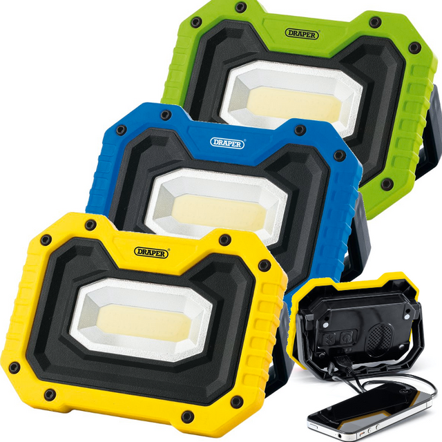 5 watt COB work light with high and low 2 light settings, fitted with a built-in wireless speaker and a battery power indicator. Charged via a micro USB cable and fitted with a standard USB output socket for powering/charging items such as mobile phones. Manufactured from shock resistant plastic and fitted with a rubber surround and support stand with magnetic base. Supplied with a pivot stand and a micro USB to USB cable.