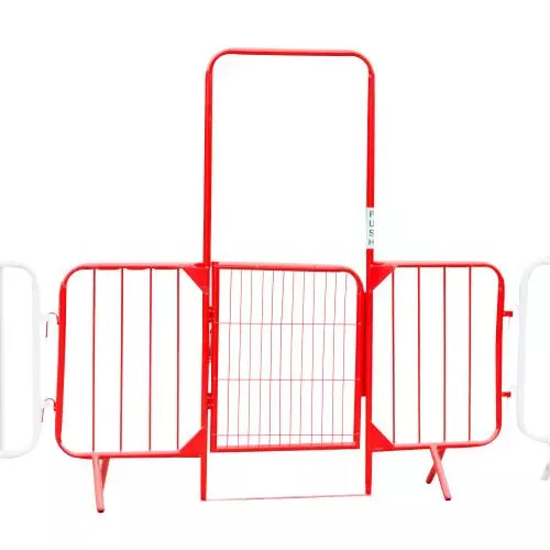 Advanced Walkthrough Crowd Barriers are manufactured with a spring loaded gate in order to help control pedestrian access on construction sites and at events. The walkthrough barriers are connected to standard crowd control barriers using the hooks & eyes on each end and are powder coated red to increase their visibility to the public & members of staff.