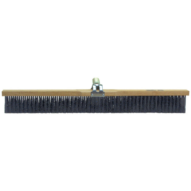 Brush down newly poured concrete after floating with these black nylon bristles to provide a fine finish. Popular for finishing sidewalks and driveways or wherever a finish with some traction is desired. Three rows of long-wearing 3" bristles are set solidly in the laminated wood base. The 36" base is smooth for use by hand in small spaces and touch ups. A metal handle bracket fits around the base and protrudes at an angle for natural push sweeping motions. Use with the standard broom thread handles. Kraft Tool's 5' Broom Thread Wood Handle (CC163) is recommended. For more versatility use a handle adapter for use with bull float handles.