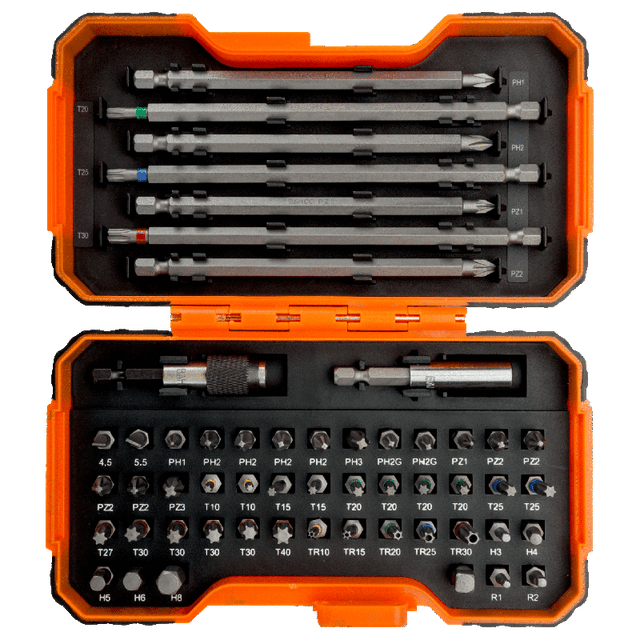 - TORX® bits: T10 x2, T15 x2, T20 x4, T25 x2, T27, T30 x4, T40